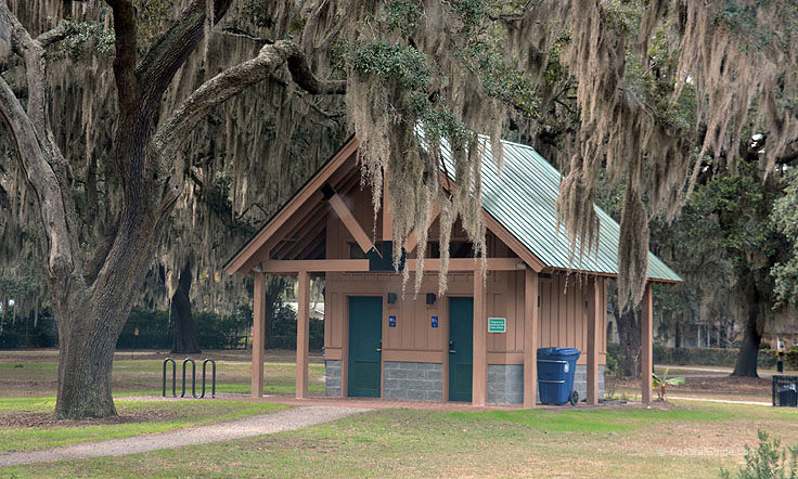 The big attraction at the park, besides the ample playground equipment which will keep young patrons smiling, are the abundant live oak trees, covered in Spanish Moss, which provide a wide canopy of shade in virtually every area of the site. In fact, the low-hanging Spanish moss appears to drape over the entire scene, making the park gorgeously attractive and almost mythical-looking during every season.